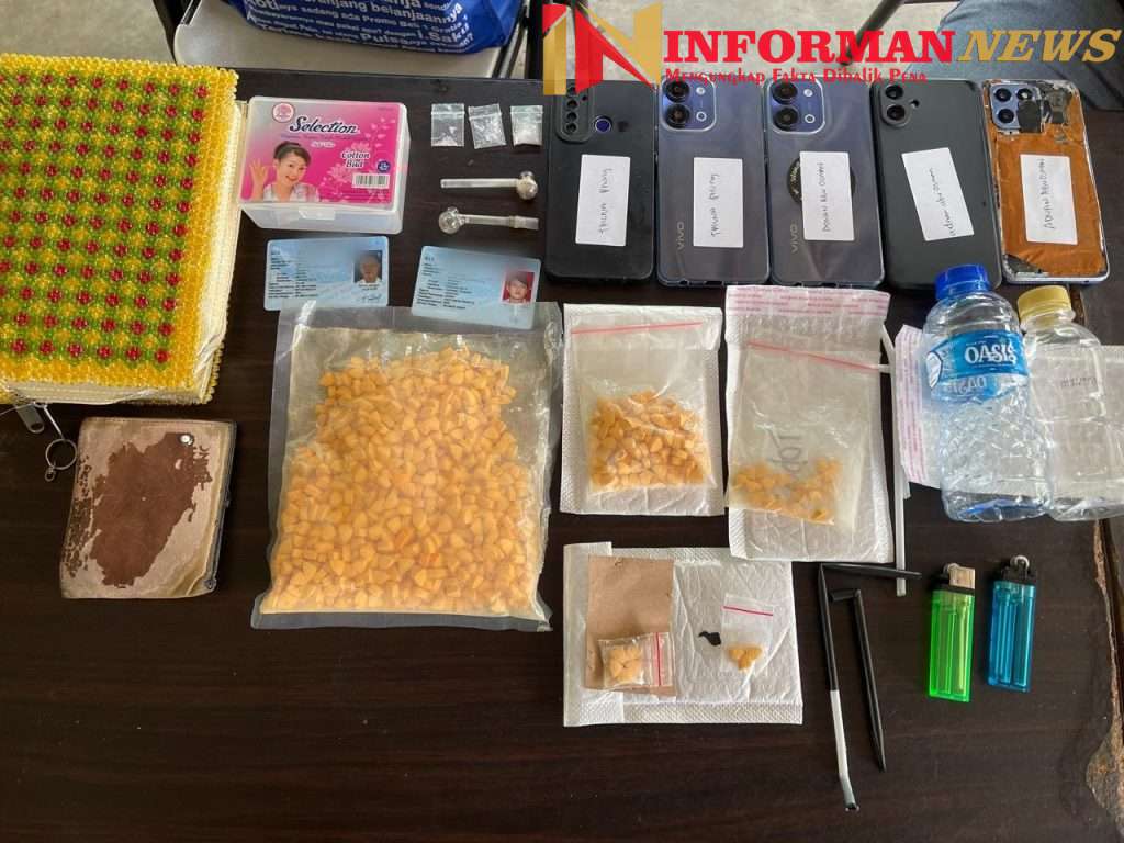 Dari hasil penggeledahan, petugas menemukan barang bukti berupa 1.013 butir pil ekstasi seberat 343 gram, tiga paket sabu seberat 1,27 gram, alat hisap, beberapa unit handphone, serta buku catatan yang diduga terkait transaksi narkotika.