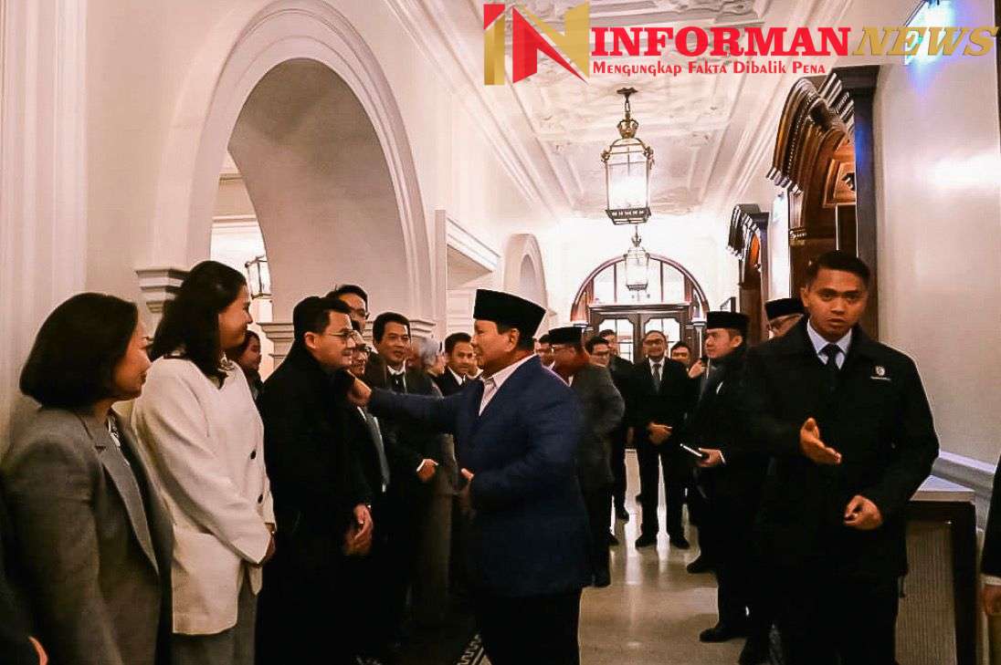 London- InformanNews.com|| Presiden Republik Indonesia Prabowo Subianto tiba di hotel tempatnya bermalam selama kunjungan kerja di London, Inggris, pada Minggu, 18 Januari 2026. Setibanya di lokasi, Kepala Negara disambut hangat oleh sejumlah menteri kabinet Merah Putih yang telah tiba terlebih dahulu, jajaran KBRI London serta mahasiswa dan diaspora Indonesia yang tengah menempuh pendidikan di Inggris.