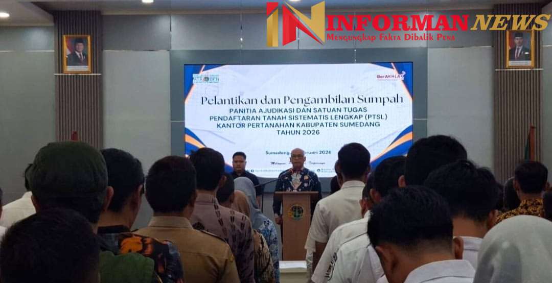 Sumedang- InformanNews.com|| Kepala Kantah Kabupaten Sumedang, Tonni Seto Soekemi, S.Kom., M.A.P. Pimpin Langsung Pelantikan dan Pengambilan Sumpah Panitia Ajudikasi, Satuan Tugas Fisik, Satuan Tugas Yuridis, dan Satuan Tugas Administrasi PTSL Tahun 2026 . Pelantikan bertempat di Aula Kantor Pertanahan Kabupaten Sumedang. Kamis (12/02/2026)