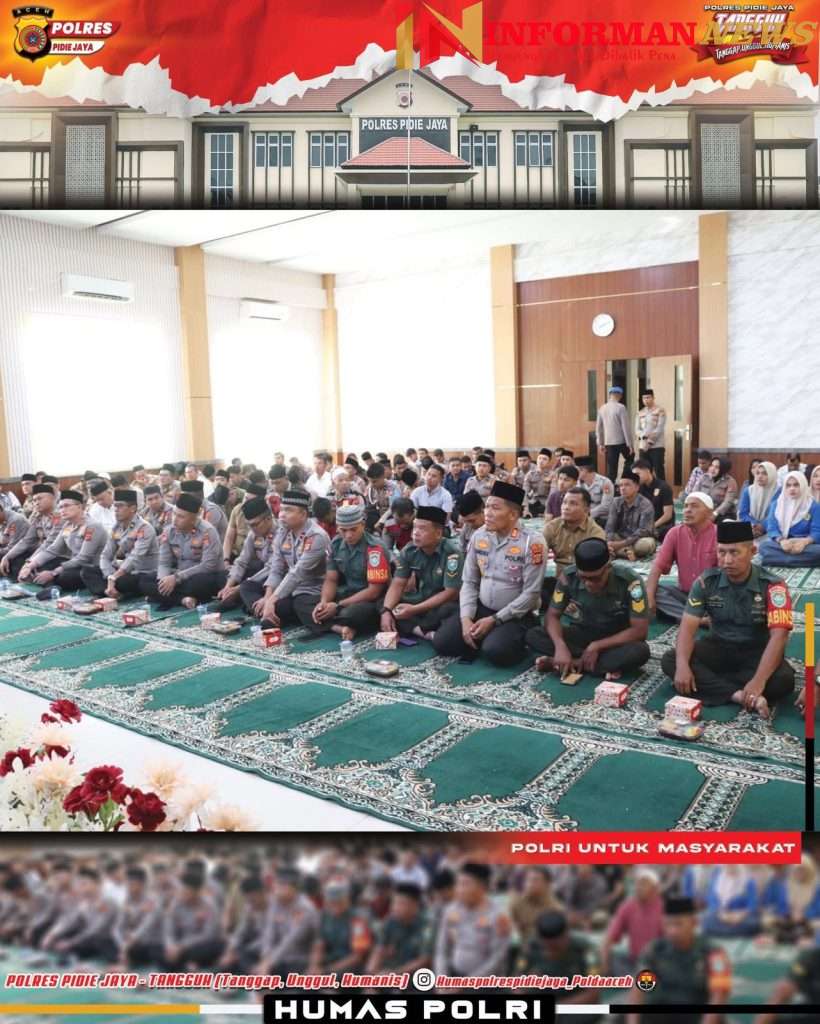 PIDIE JAYA – Informannews || Dalam rangka memperingati Maulid Nabi Muhammad SAW 12 Rabiul Awal 1447 H / 2025 M, Polres Pidie Jaya melaksanakan kegiatan doa bersama untuk keselamatan negeri yang diawali dengan mengikuti Zoom Meeting bersama Polda Aceh, pada Kamis (11/9/2025) pukul 07.30 WIB di Aula Tathya Dharaka Polres Pidie Jaya.