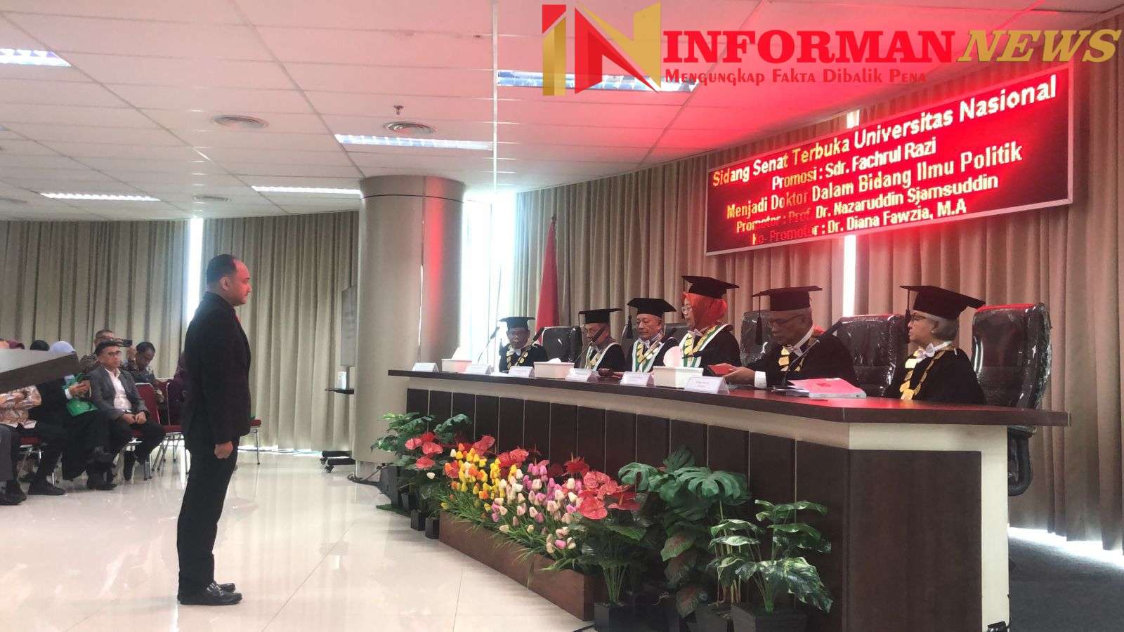 Jakarta – InformanNews|| Tokoh politik Indonesia dan mantan senator DPD RI dari Aceh, Dr. Fachrul Razi, S.I.P., M.I.P., M.Si., M.H., M.I.Kom, telah resmi menyandang gelar doktor ilmu politik dari Universitas Nasional Jakarta setelah berhasil mempertahankan disertasinya di hadapan panel penguji, bertempat di Menara Universitas Nasional, Selasa (24-02-2026). Disertasinya yang berjudul ” Integrasi Politik di Aceh Pasca MoU Helsinki: Studi Pelembagaan Politik Wali Nanggroe (2013-2024),” memberikan analisis yang serius tentang lanskap politik Aceh dan memperingatkan bahwa potensi konflik antara Aceh dan pemerintah pusat tetap sangat tinggi.