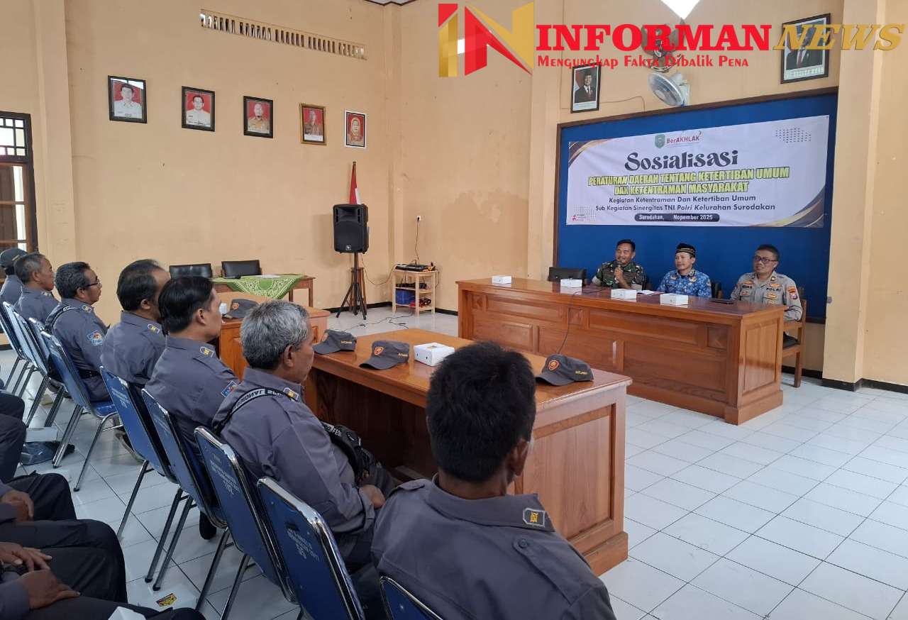 Trenggalek – Informannews|| Sinergi TNI dan Polri dalam menjaga kondusivitas wilayah kembali tampak kuat di Kabupaten Trenggalek. Pendekatan edukatif menjadi strategi yang terus digencarkan satuan teritorial untuk mencegah potensi kerawanan. Salah satunya melalui sosialisasi peraturan daerah tentang ketertiban umum dan ketentraman masyarakat yang diberikan kepada Linmas Kelurahan Surodakan, Kecamatan Trenggalek, Selasa (11/11/2025).