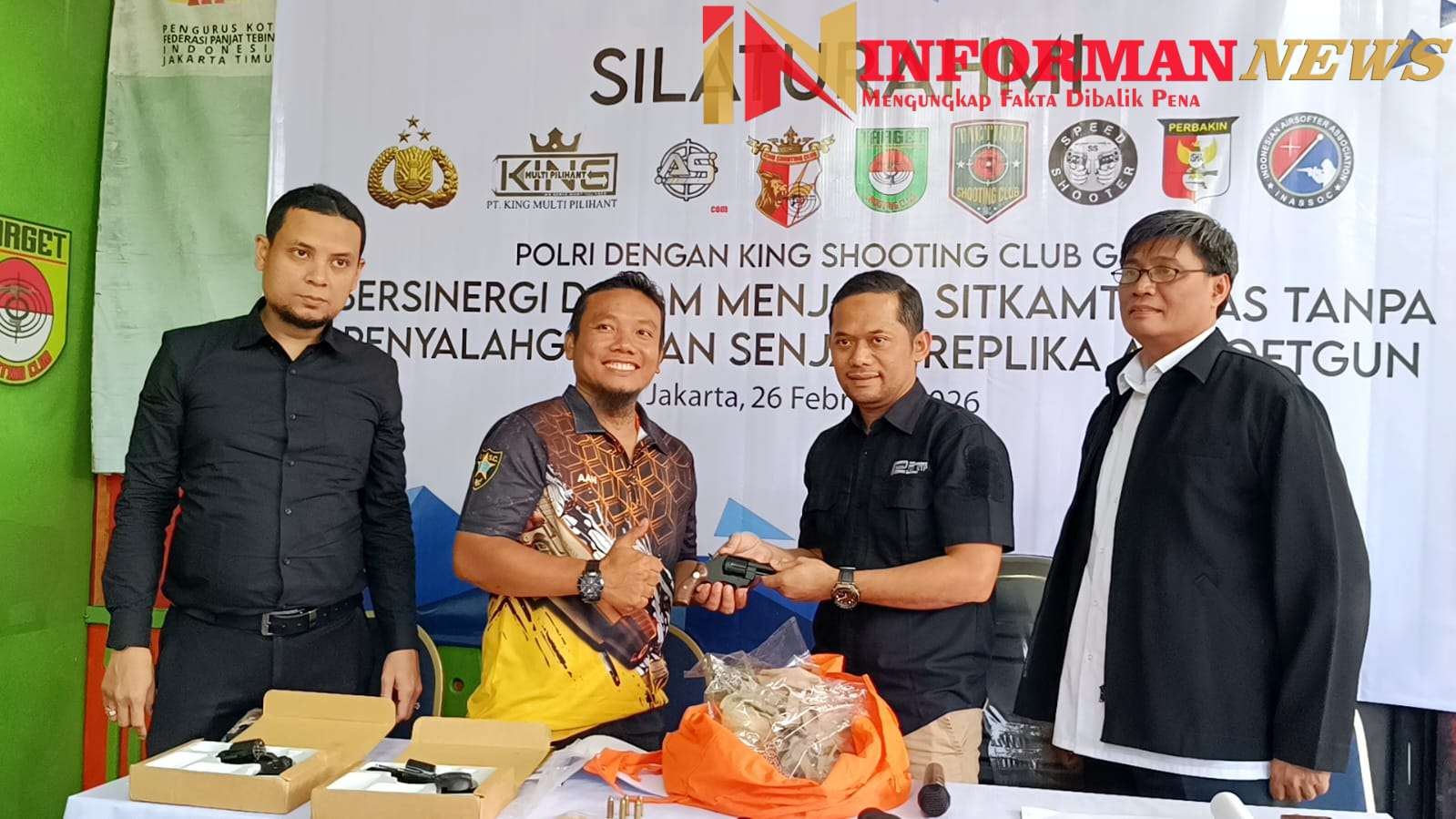 Jakarta – Polri bersama King Shooting Club Grup menggelar sosialisasi regulasi airsoft gun di GOR Ciracas, Kamis (26/2/2026). Kegiatan ini diwarnai penyerahan sukarela senjata api ilegal, amunisi, dan senjata replika berbahaya oleh warga.