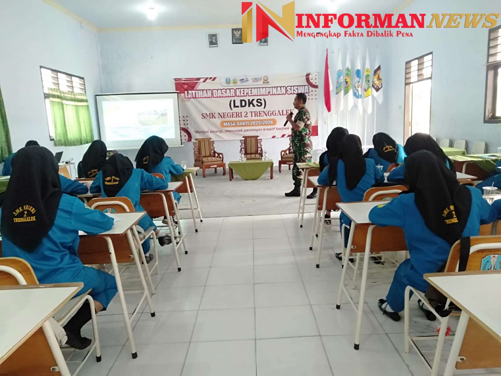 Trenggalek – Informannews|| Upaya TNI dalam memperkuat karakter kebangsaan di kalangan pelajar terus digencarkan melalui program pembinaan teritorial. Hal ini terlihat dalam kegiatan Latihan Dasar Kepemimpinan Sekolah (LDKS) SMKN 2 Trenggalek yang digelar Minggu (16/11/2025). Koramil 0806-01/Trenggalek menghadirkan Bati Wanwil, Pelda M. Tajib, untuk memberikan materi Wawasan Kebangsaan (Wasbang) dan Tata Upacara Sekolah (TUS) kepada peserta didik masa bakti 2025–2026.